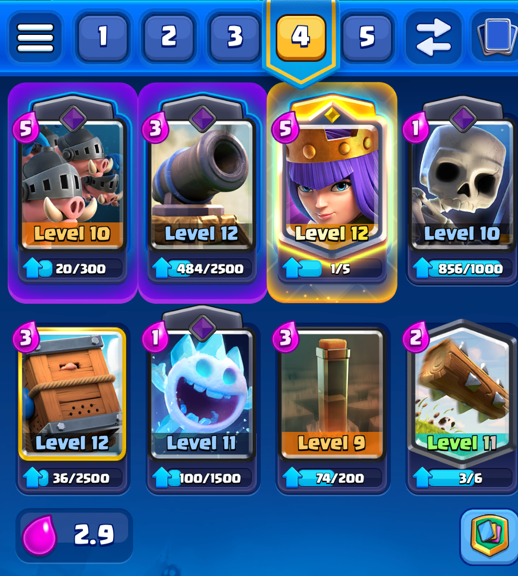 This isn't my own homebrew like the others, it is a meta deck and I was mainly playing it during the temporary boost that the piggy's got. I don't play it as much now as it is severally underlevelled. Though it is a fun deck, archer queen is super strong on defense and royal delivery is always satisfying.
