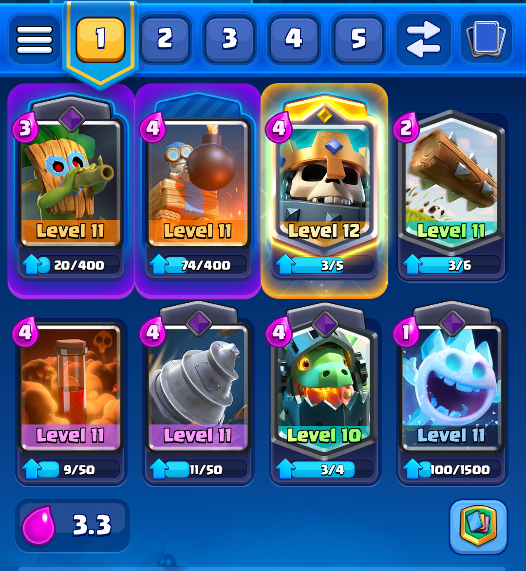 Skeleton King is a champion that people don't like because it's not as good but I am here to combat that, Skeleton King is great on defense, great on offense and is just a great all rounder which makes it great in decks like graveyard. But I suck at Graveyard so instead I put it in this Goblin Drill deck, where it plays a similar role as it would in a graveyard deck which is for counterpushing. The inferno dragon is to get rid of tanks and the bomb tower is for building targetting troops and swarms. Overall, I do have a lot of fun playing this but the main problem is the deck being pretty underlevelled so I don't play it as much anymore.
